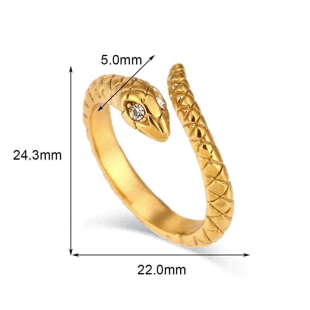 Entdecken Sie die zeitlose Eleganz mit dem Vintage-Schlangenring von Megan Joias. Dieses atemberaubende Accessoire ist aus hochwertigem Edelstahl 316L gefertigt und bietet Langlebigkeit sowie Fleckenbeständigkeit. Mit seinem geschwungenen Schlangendesign und einem funkelnden Kristallauge, das mit 18K-Gold beschichtet ist, verleiht dieser Ring Ihrem Look einen Hauch von Luxus und Raffinesse.