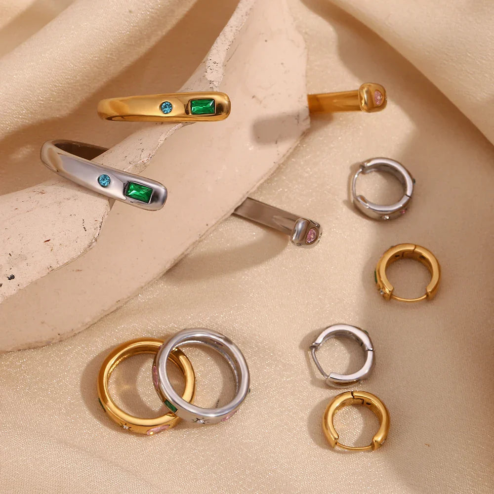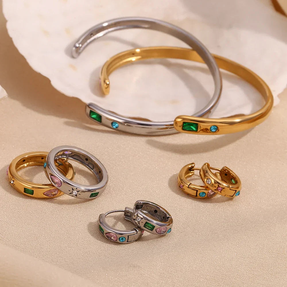 Raffiniertes Design: Die Kombination aus geometrischen Formen und farbigen Steinen schafft einen modernen und eleganten Look.